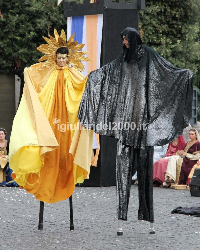 I Trampolieri sono figure artistiche molto ricercate e apprezzate per la loro figura allungata e di grande impatto visivo e folcloristico. La loro originalità stà proprio nella loro agilità di movimento malgrado l’estrema altezza dal suolo.