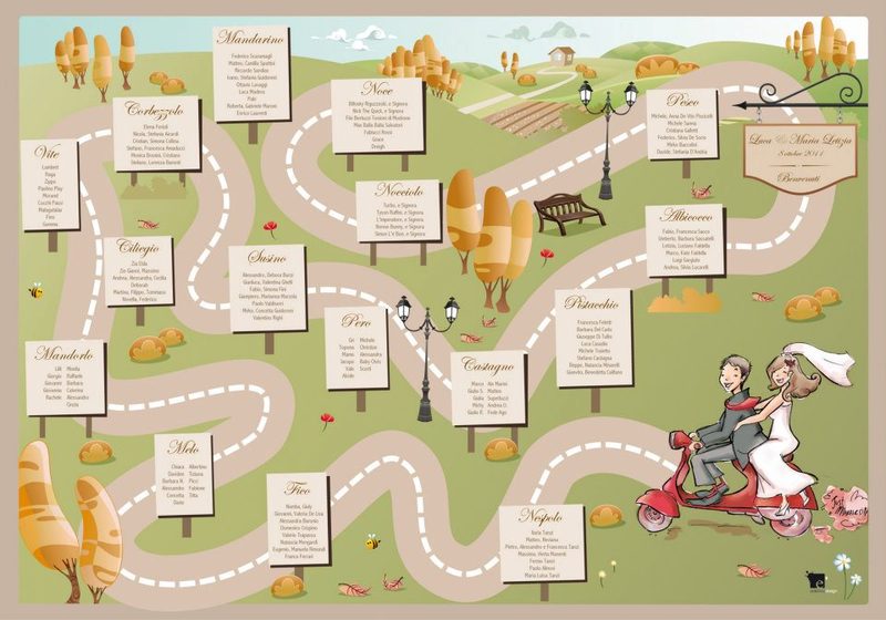 Il nostro Caricaturista è disponibile anche per l’eventuale realizzazione di un simpaticissimo ed esclusivo “Tableau de Mariage” da posizionare all’ingresso della sala nuziale con l’organigramma personalizzato dell’assegnazione dei posti a tavola per gli invitati alla cerimonia. Di seguito proponiamo alcuni esempi di lavori già eseguiti: