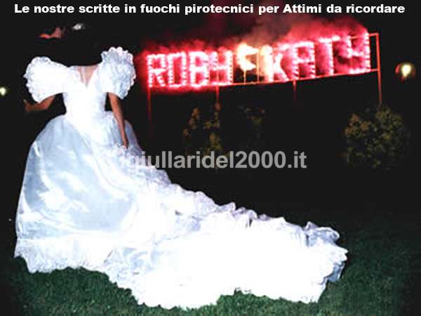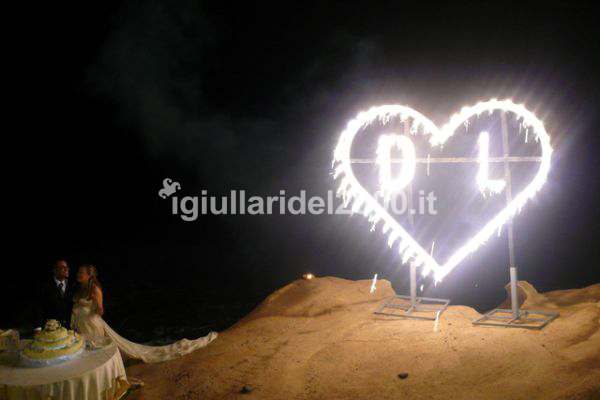 Per il gran finale di eventi, party e cerimonie, siamo in grado di realizzare Scritte di Fuoco (Nome dell’Evento, Nomi degli Sposi, Numeri, Frasi Augurali) o Simboli giganti (Cuore con Iniziali Sposi all’interno, Stemma o Logo Aziendale) che al momento desiderato si illuminano di fuoco scintillante per rendere unico e assolutamente magico l’epilogo di qualsiasi evento da ricordare.